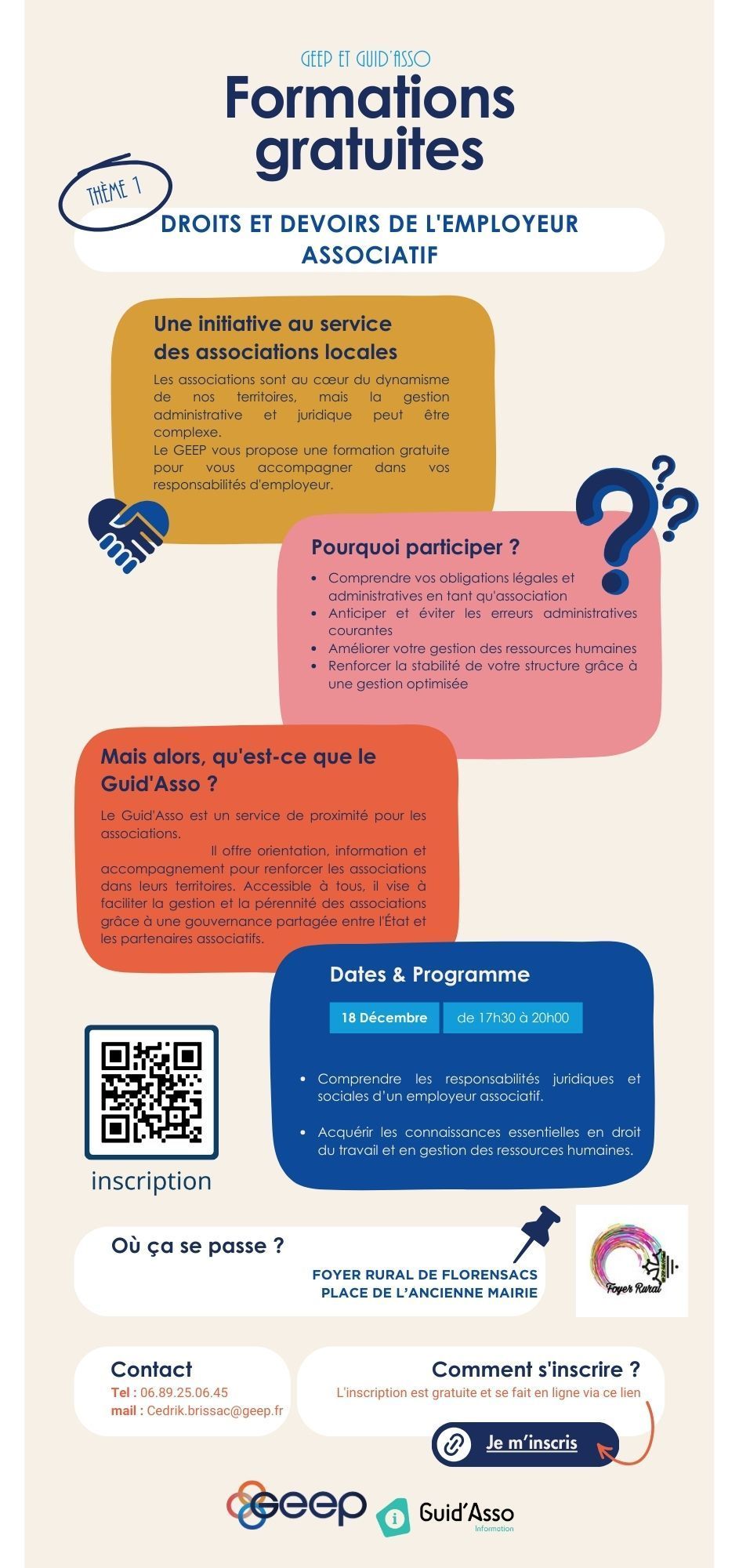 Le GEEP vous propose une formation gratuite le mercredi 24 novembre de 17h à 20h au Foyer Rural de St Martin de Londres (34380) pour vous accompagner dans vos responsabilités d'employeur. Une initiative au service des associations locales pour : • Comprendre vos obligations légales et administratives en tant qu'association • Anticiper et éviter les erreurs administratives courantes • Améliorer votre gestion des ressources humaines • Renforcer la stabilité de votre structure grâce à une gestion optimisée Contact et information : Cedrik.brissac@geep.fr Tel 06 89 25 06 45